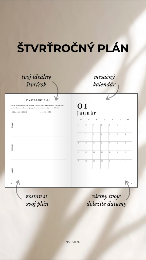 Vylepšený diár poskytuje viac možností, ako si plánovať svoje kroky na rôznych úrovniach. Už žiadny chaos a nejasnosti – teraz môžeš plánovať nie len svoj rok, ale aj štvrťroky s maximálnou prehľadnosťou a efektivitou. Plánovanie na každej úrovni ti pomôže zamerať sa na svoje ciele, postupne si ich rozdeliť a dosiahnuť ich krok za krokom.