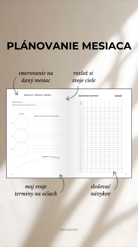 - Mesačné plánovanie: Každý mesiac ti ponúka priestor na definovanie svojich priorít, rozdelenie veľkých cieľov na menšie úlohy a nastavenie smerovania.