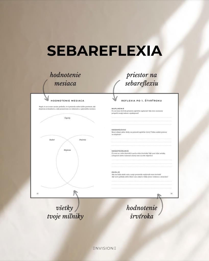 Na konci každého mesiaca a štvrťroka nájdeš priestor na sebareflexiu, kde si môžeš zhodnotiť, čo ti išlo dobre, čo si sa naučil a na čom treba ešte popracovať. Sebareflexia je nevyhnutná na ceste osobného rastu – pomáha ti udržiavať motiváciu, oslavovať úspechy a učiť sa z neúspechov.